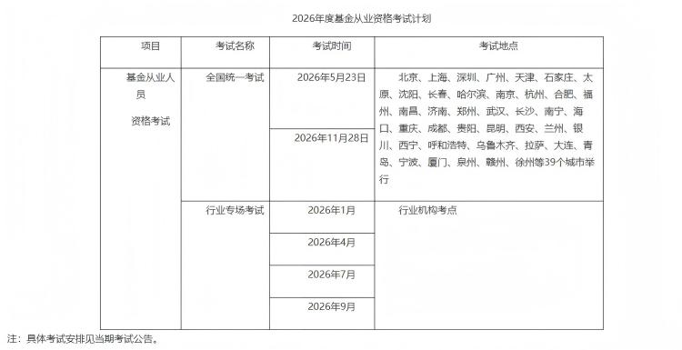 中国证券投资基金业协会现将2026年度考试计划公告如下: