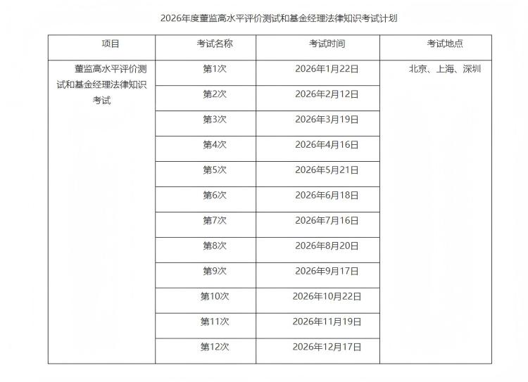 2、董监高水平评价测试和基金经理法律知识考试拟在北京、上海、深圳举办12次。