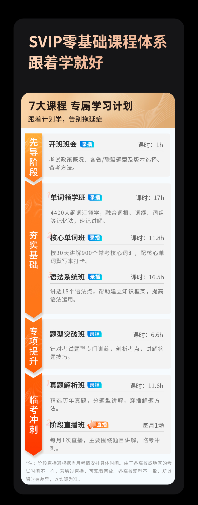 6大录播+每月阶段直播(有回放),共7个班次,针对不同学习阶段,帮你从单词、语法、题型、真题等模块逐步进阶,一次吃透考点!不怕你学不会,就怕你不学!