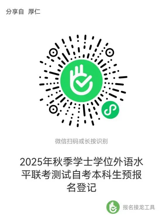 用微信扫描下方二维码,填写姓名、性别、自考准考证号等信息,完成预报名。