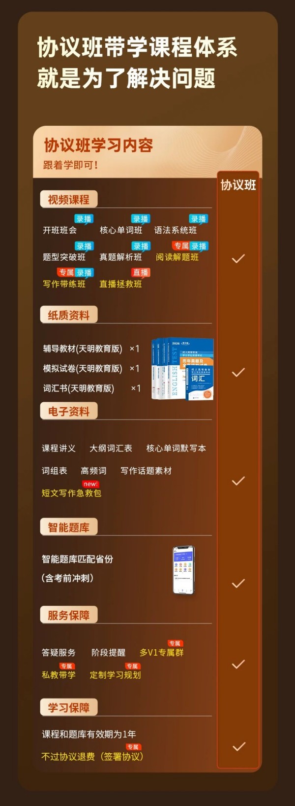 为了让大家备考没有后顾之忧,2026年学位英语协议班针对性设置适配多省份/联盟的课程,全国考生都能选!
