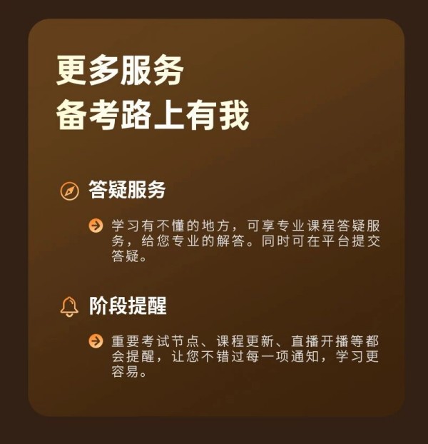 备考路上你并不孤单!从报名到考试全程指导服务,避免踩坑,考试、课程等重要消息提醒,不错过每一个你值得关注的点!