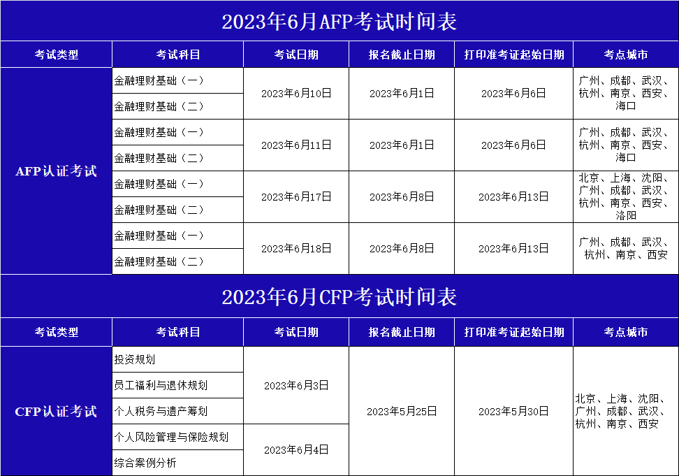 2023年6月每次考试的考试日期、报名截止日期及打印准考证起始日期请详见下表: