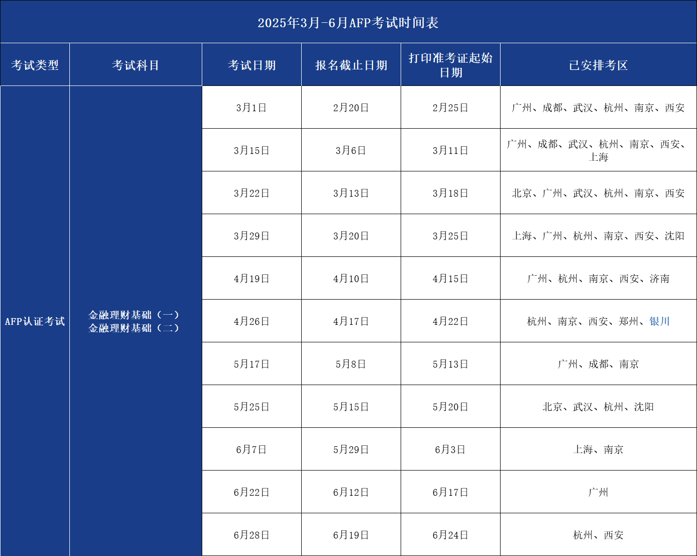 现代国际金融理财标准(上海)有限公司发布“关于2025年4月-6月CFP/AFP考试时间表的通知”后,应考生需求新增加银川考区,考试时间表具体如下: