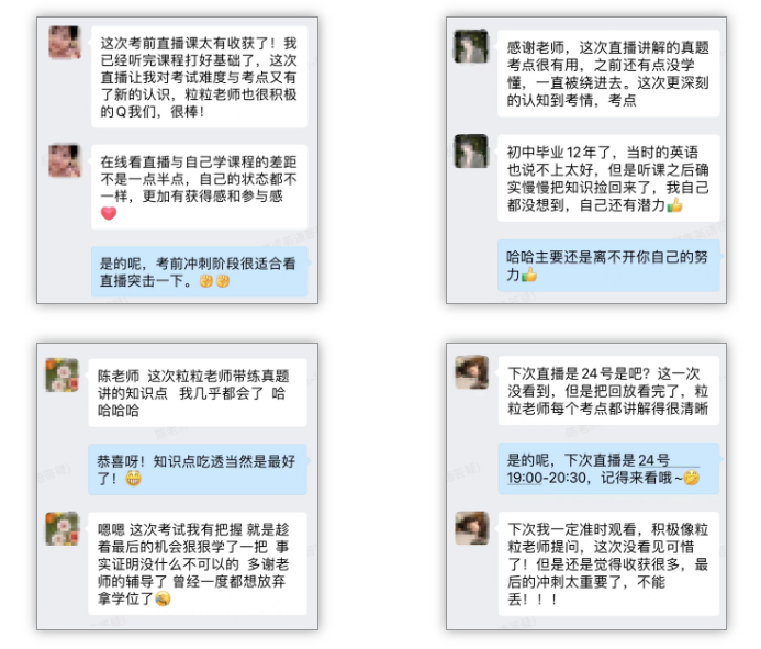 钉题库自考英语二全程班/旗舰班,配套的直播课第二场即将开讲,第一场直播已结束(没到播的同学可以前往课程学习)!第二场千万别错过,直播课将由授课老师粒粒老师主讲,重点讲解填词补文、阅读判断等典型考题,复盘答题技巧,帮助学员考前突击拿分;课中含实时答疑互动,不懂的问题可以及时打在评论区让老师零距离解答!第一场直播课反馈如下,别观望了,快来听课吧!