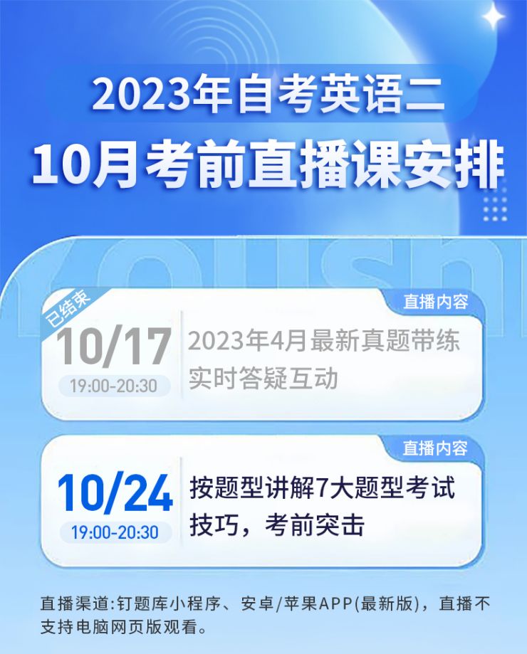 1、授课对象:已购买钉题库自考英语二全程班或旗舰班的学员