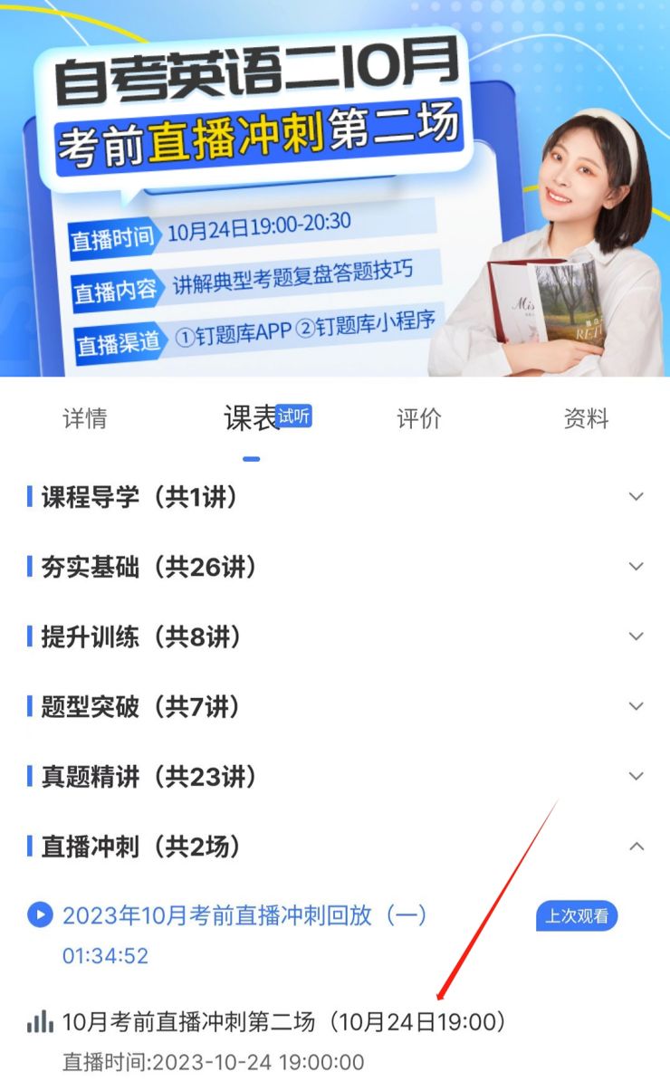 打开钉题库APP、小程序——选择自考英语二课程——直播冲刺