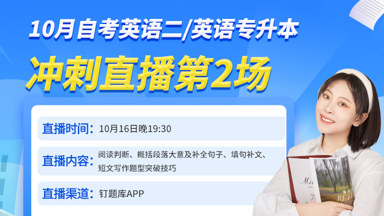 钉题库自考英语二/英语专升本【全程班 旗舰班】,配套的第2场直播课,定于10月16日19:30开启,我们直播间见!大家记得留足听课时间,做好听课准备呀!