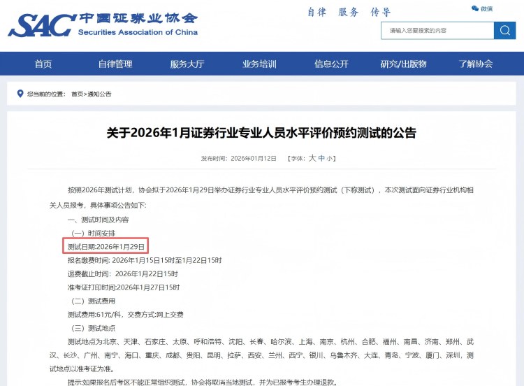 2026年证券从业1月预约测试将于1月15日15:00-22日15:00报名,1月29日考试,具体事项公告如下: