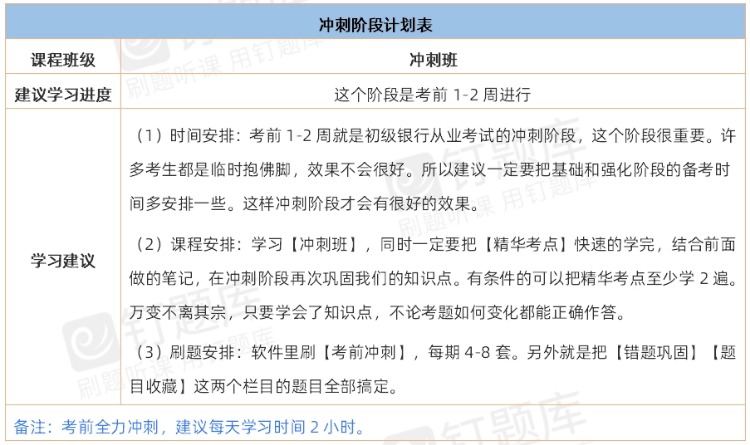 备考银行从业考试,需要制定相应的学习计划,并严格按照计划来执行,整体划分下来可以分为三个阶段,分别是基础阶段、强化阶段、冲刺阶段。