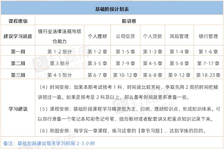 基础阶段以学习精讲班课程为主,打牢银行从业的知识基础,归纳、理顺知识点,形成知识体系,同时也可以准备一个笔记本和不同颜色的笔,结合教材和资料把重点的知识点记录下来。