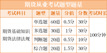 期货从业人员资格考试包括2个科目:“期货基础知识”、“期货法律法规”。通过“期货基础知识”和“期货法律法规”两个科目后。每科目考试时间均为100分钟。