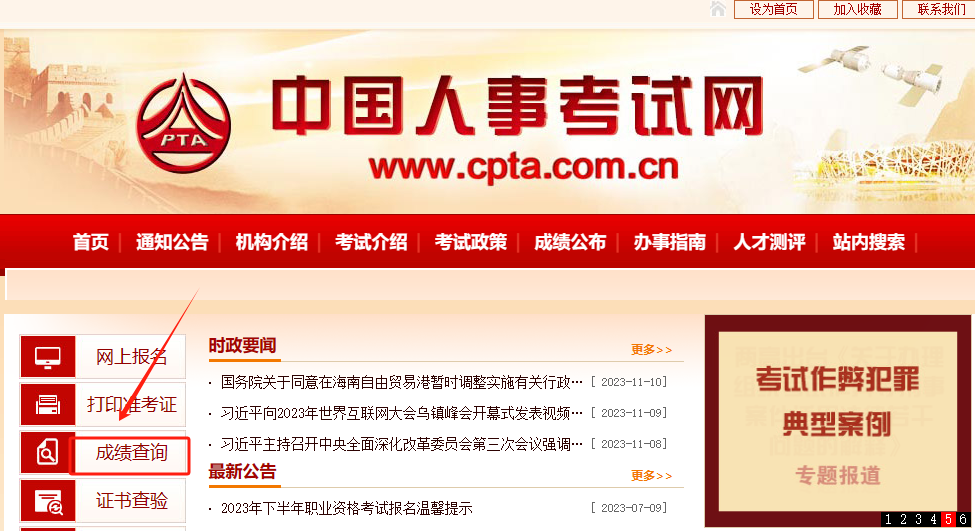 进入官网:中国人事考试网,点击左侧的“成绩查询”进入查询界面。