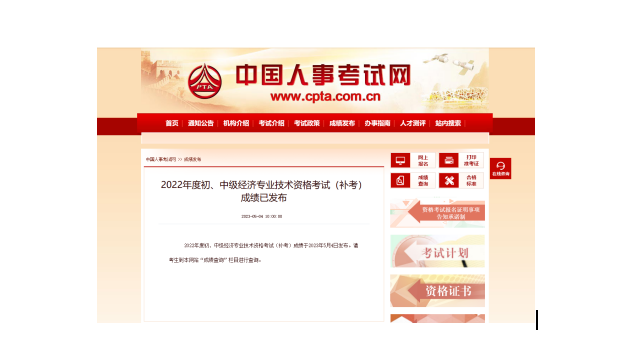 2022年度初、中级经济专业技术资格考试(补考)成绩于2023年5月4日发布。请考生到本网站“成绩查询”栏目进行查询。