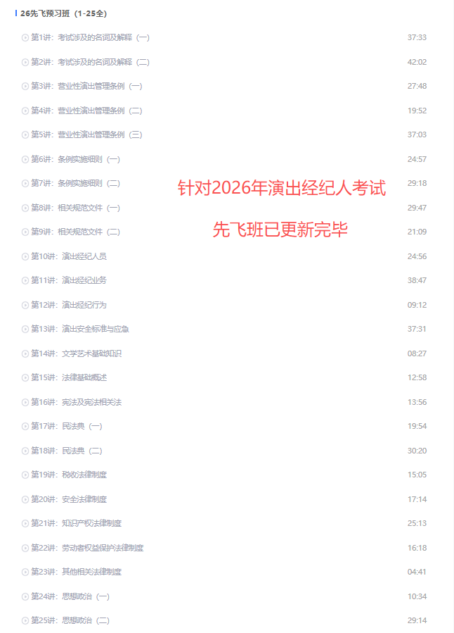 正是懂这份“从容备考”的重要性,我们针对2026年考试的课程更新,早就提上了日程——现在要跟大家正式说:2026演出经纪人先飞班,已经全部更新完毕了!
