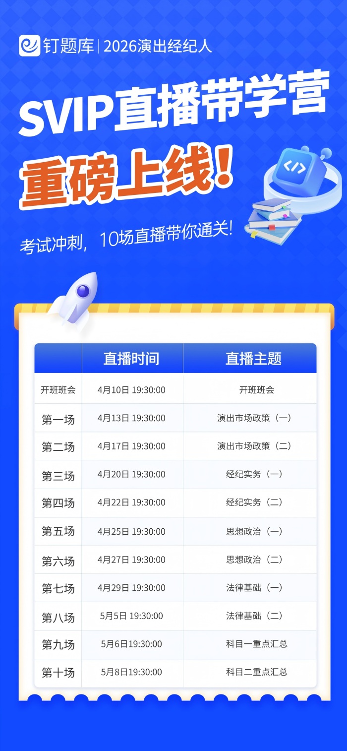 为贴合考生备考全流程,针对性解决 “进度慢、考点乱、缺指导” 等痛点,钉题库特此发布SVIP直播带学营课程安排,通过集中直播带学的方式,梳理考试核心考点、拆解难点重点,帮助大家理清备考思路、跟上学习进度,为后续冲刺做好充分准备。